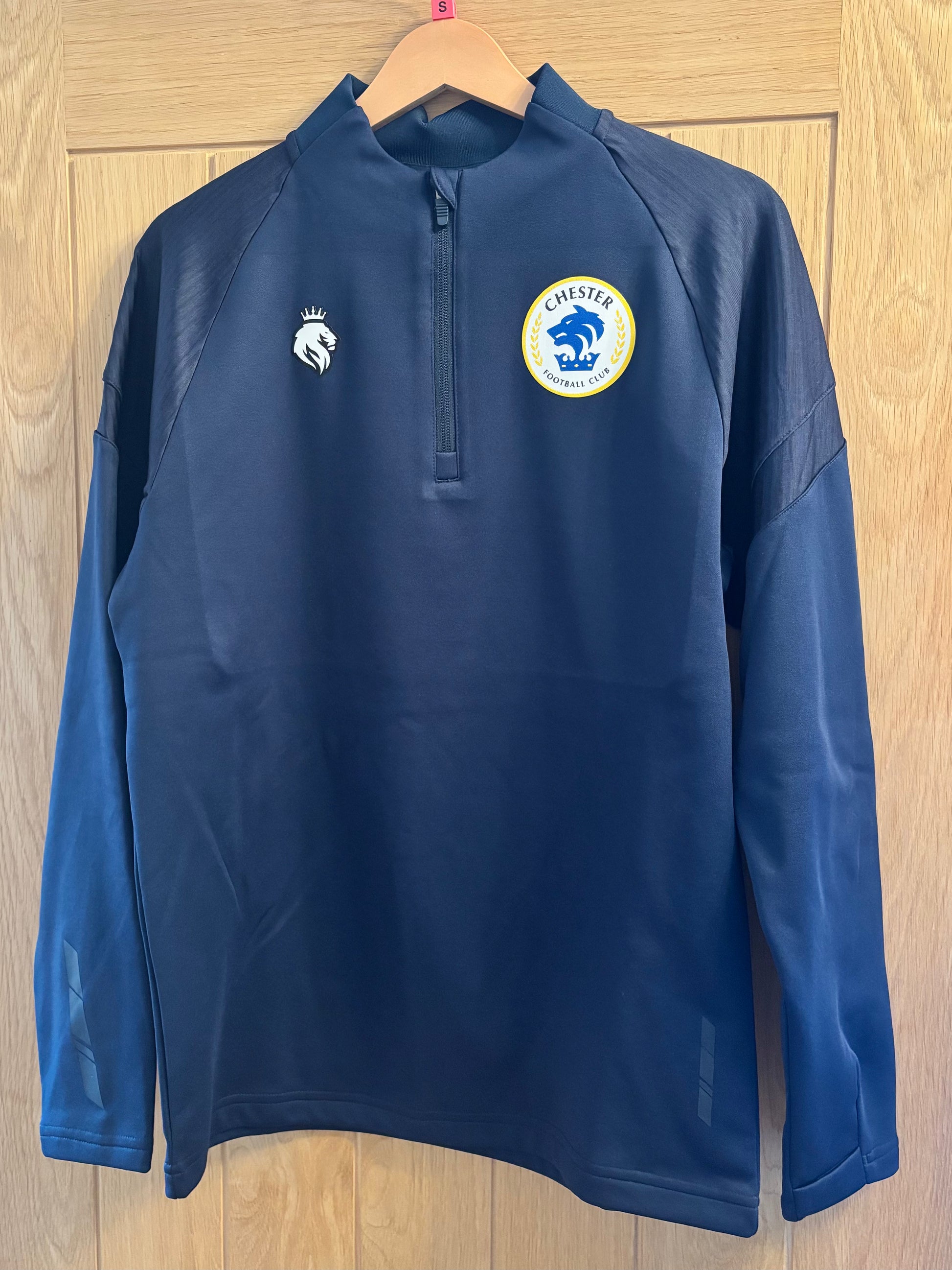 Adult sized navy 1/4 zip training top with Chester FC badge and Hope + Glory logo on the chest.